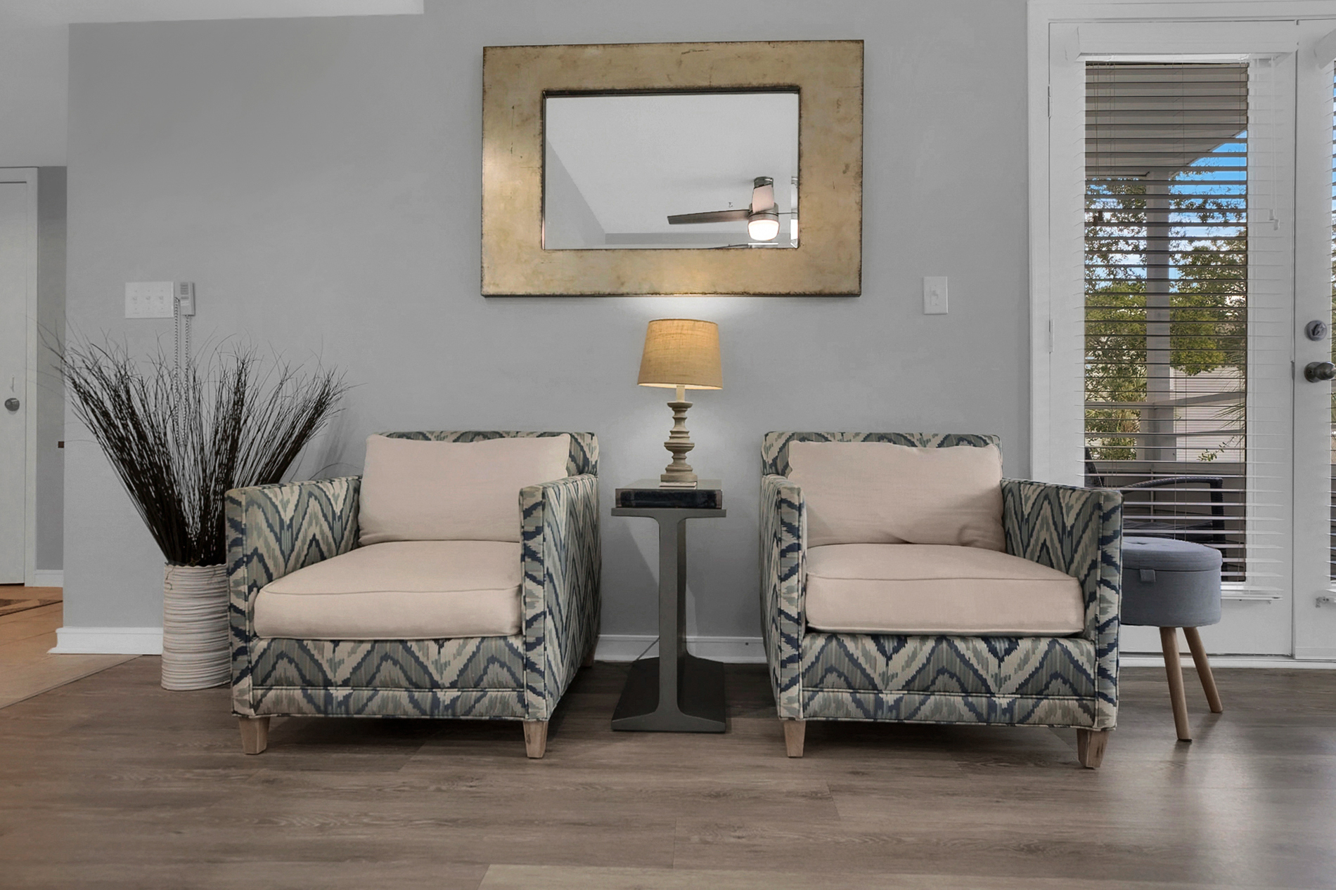 Living Room – Comfortable seating, flat-screen TV, and balcony access