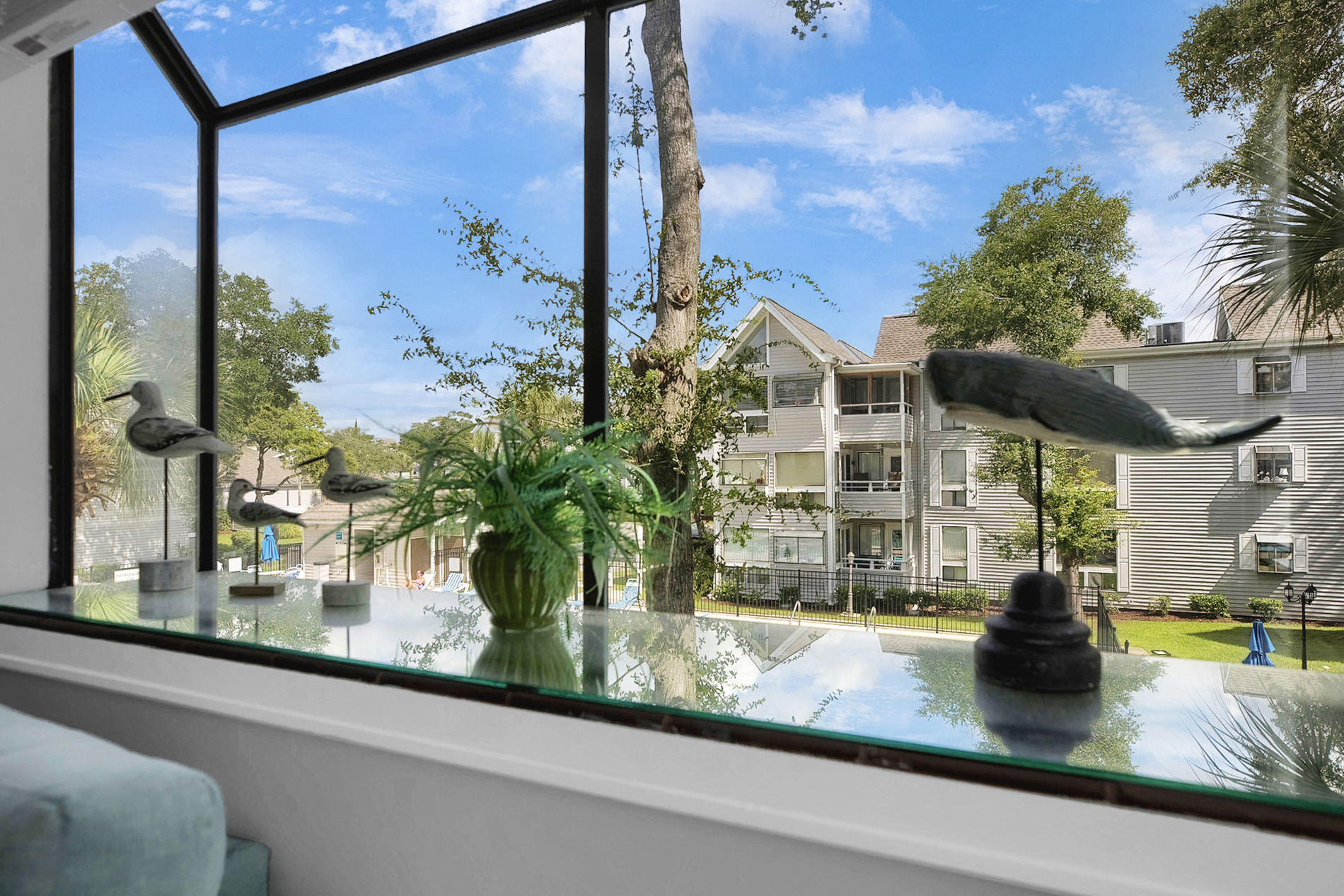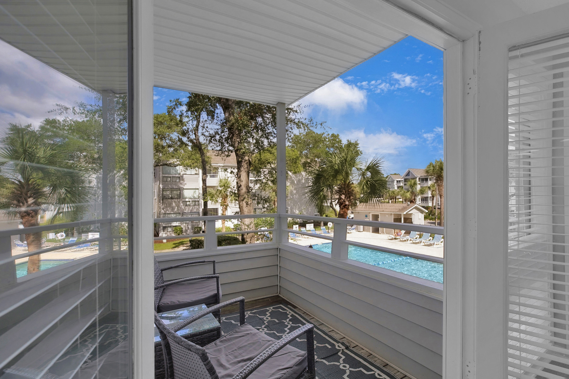 Private Balcony – Overlooks the community pool and lush resort grounds