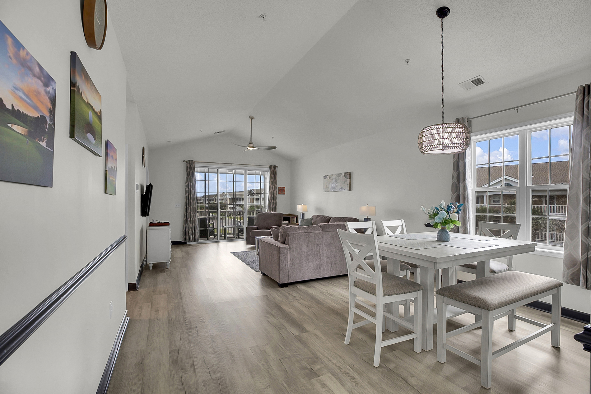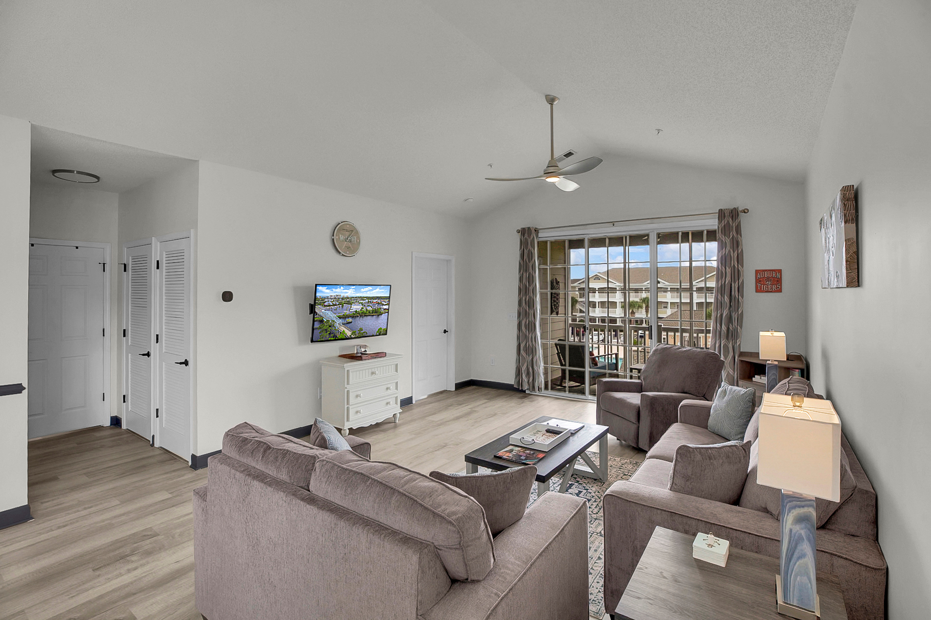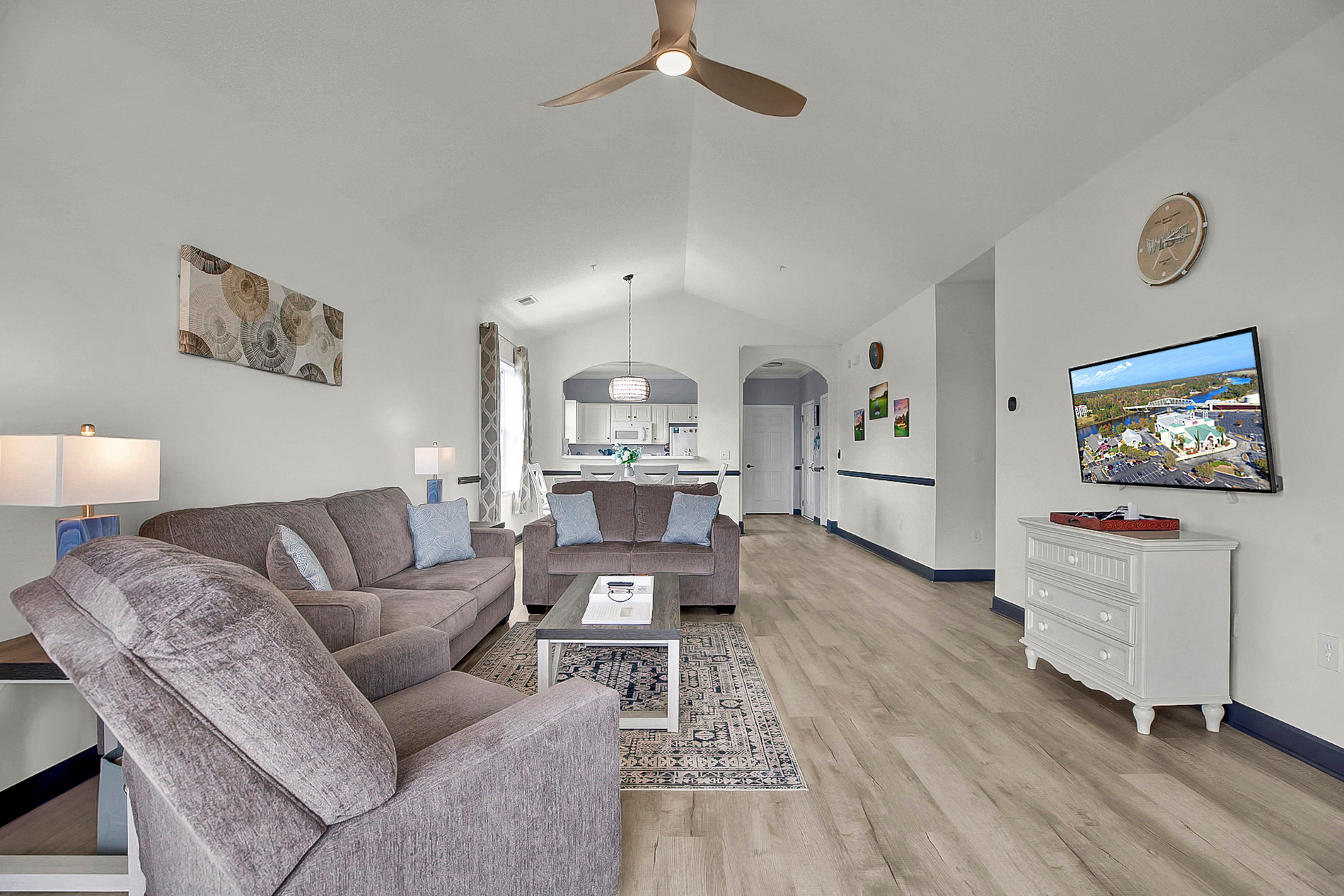 Living Area: Open floor plan with vaulted ceilings, comfortable seating, and flat-screen TV