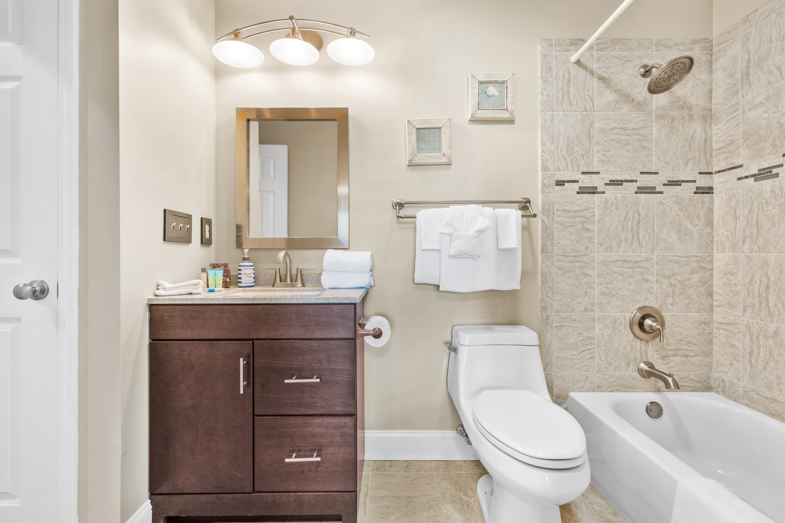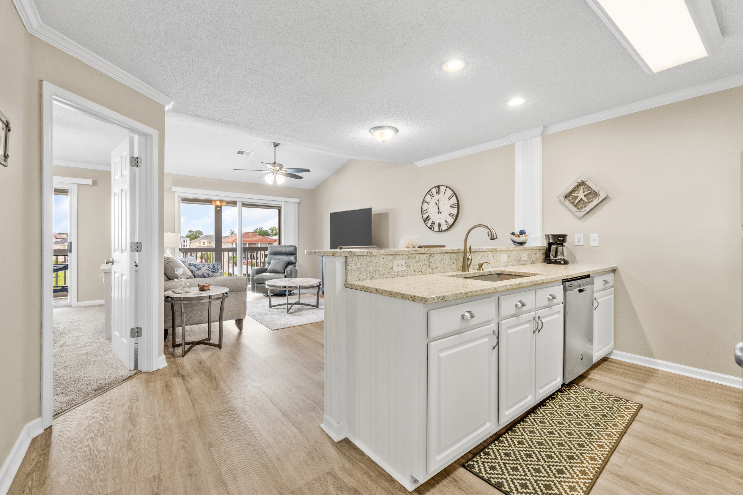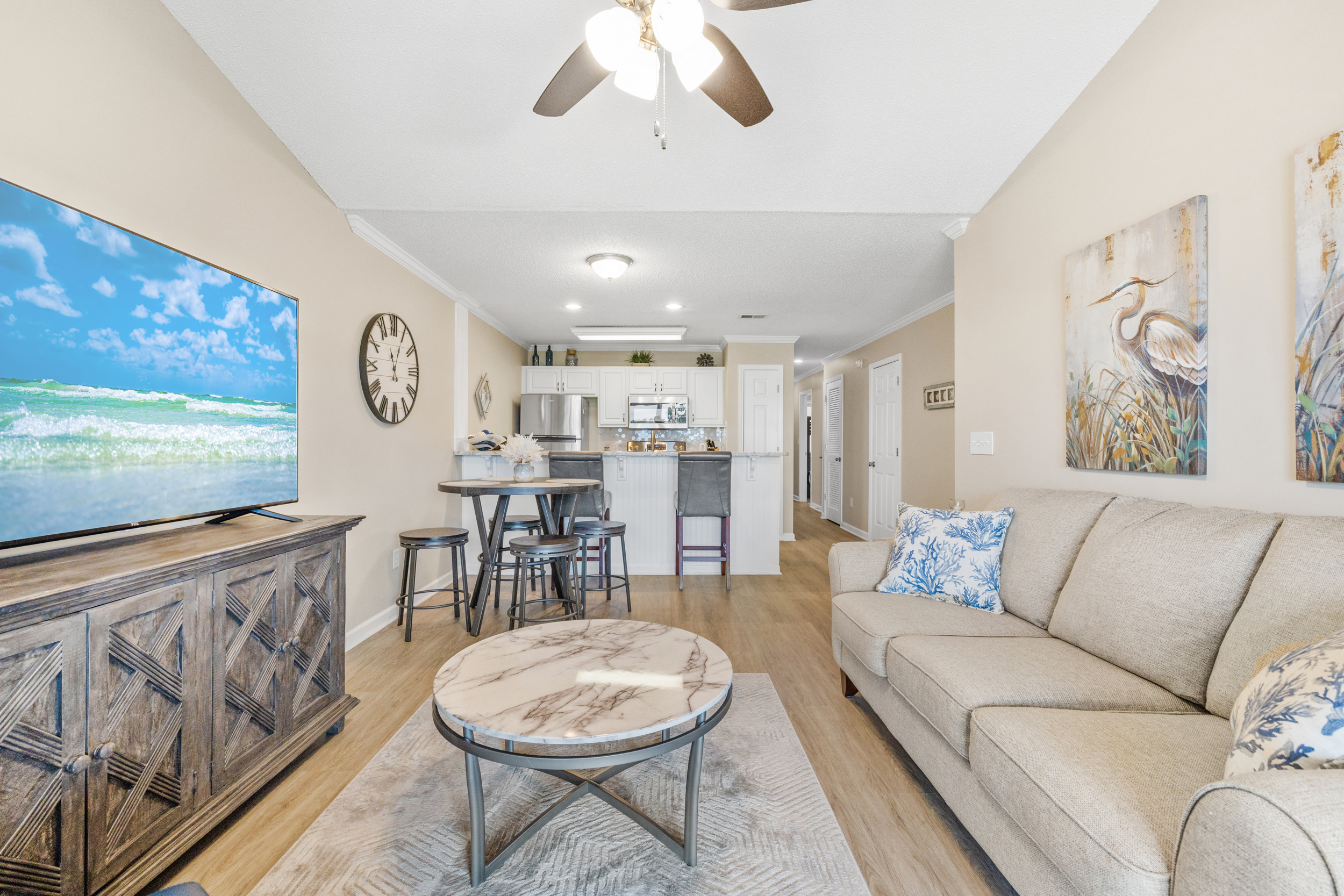 Our condo features a fully equipped kitchen, allowing for delicious family meals. But if you prefer dining out, you'll be just a stone's throw away from some of the best restaurants in town. Spend your evenings watching the sunset over the water or gathering with loved ones in the spacious living area.