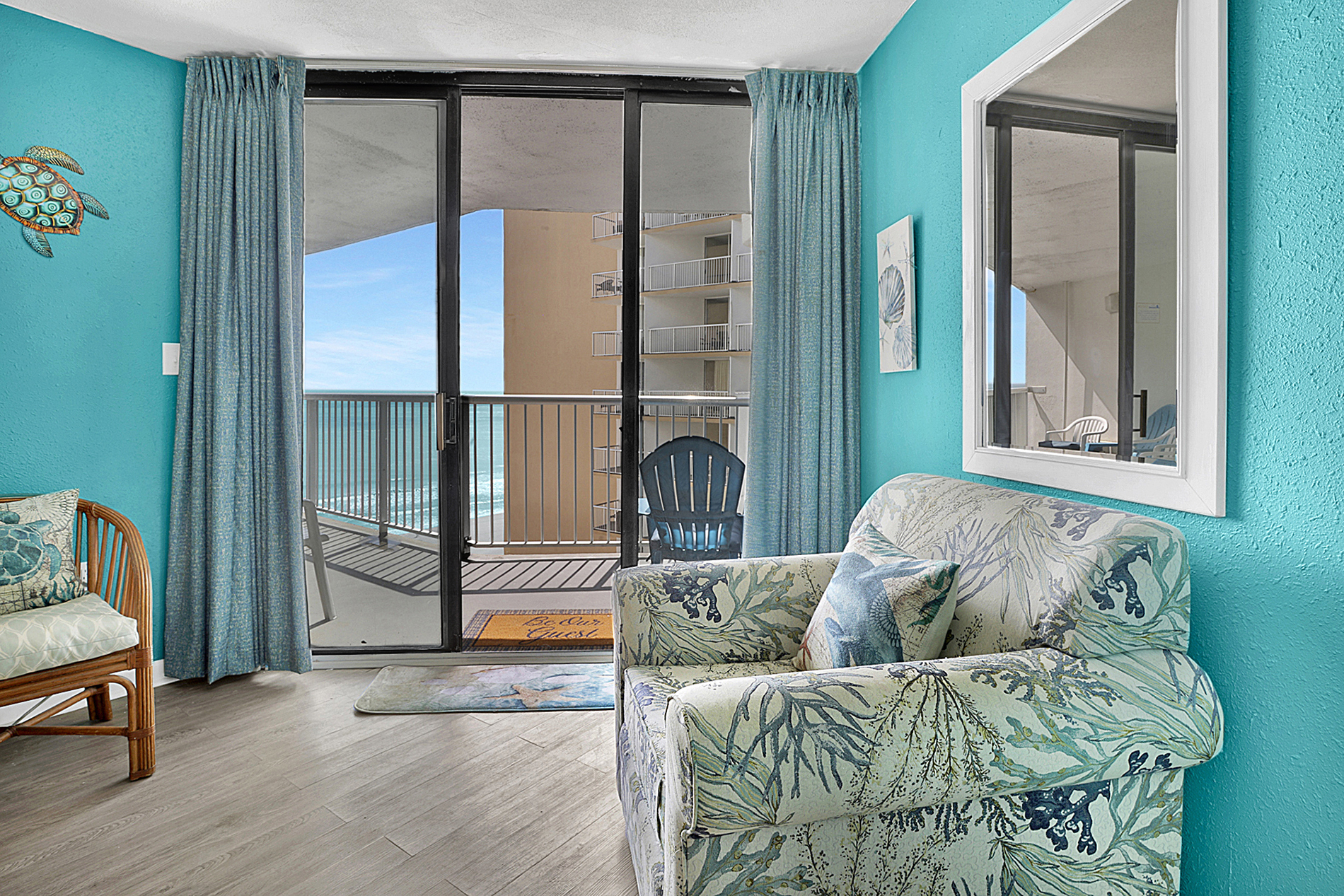 - Spacious living room with flat-screen Smart TV and direct access to the oceanfront balcony.