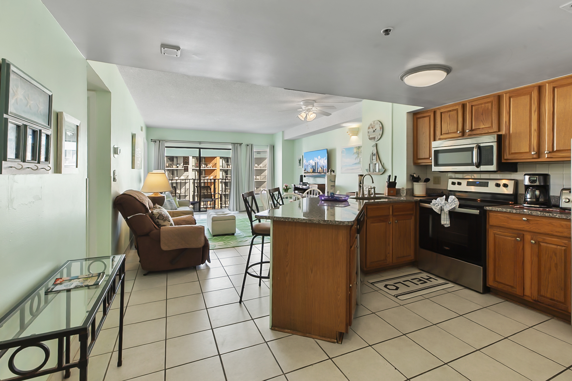 Living Area: Oceanview living space with comfortable seating, a sleeper sofa (sleeps 2) and balcony access.